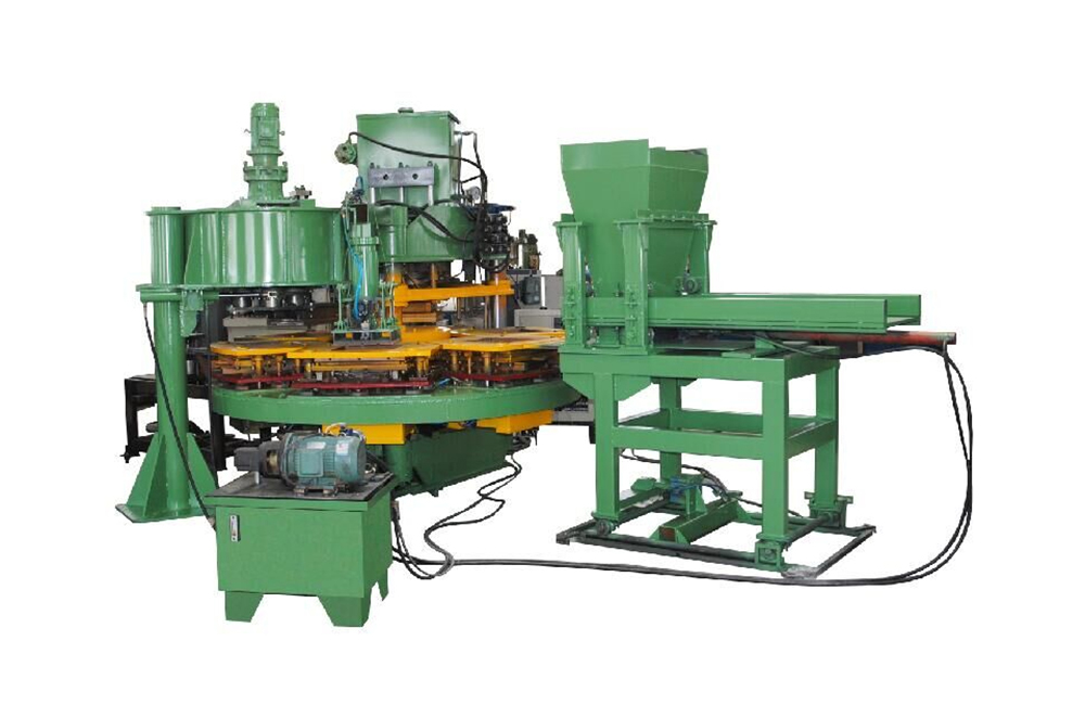 Esta máquina possui múltiplas estações de prensa de prato giratório automático, utilizadas para a produção de telhas de uma e duas camadas, pode fazer telhas de dupla camada úmida e seca, ou telhas de dupla camada seca. Controle de computador PLC, alto grau de automação, estrutura de aço de alta resistência, longa vida útil.